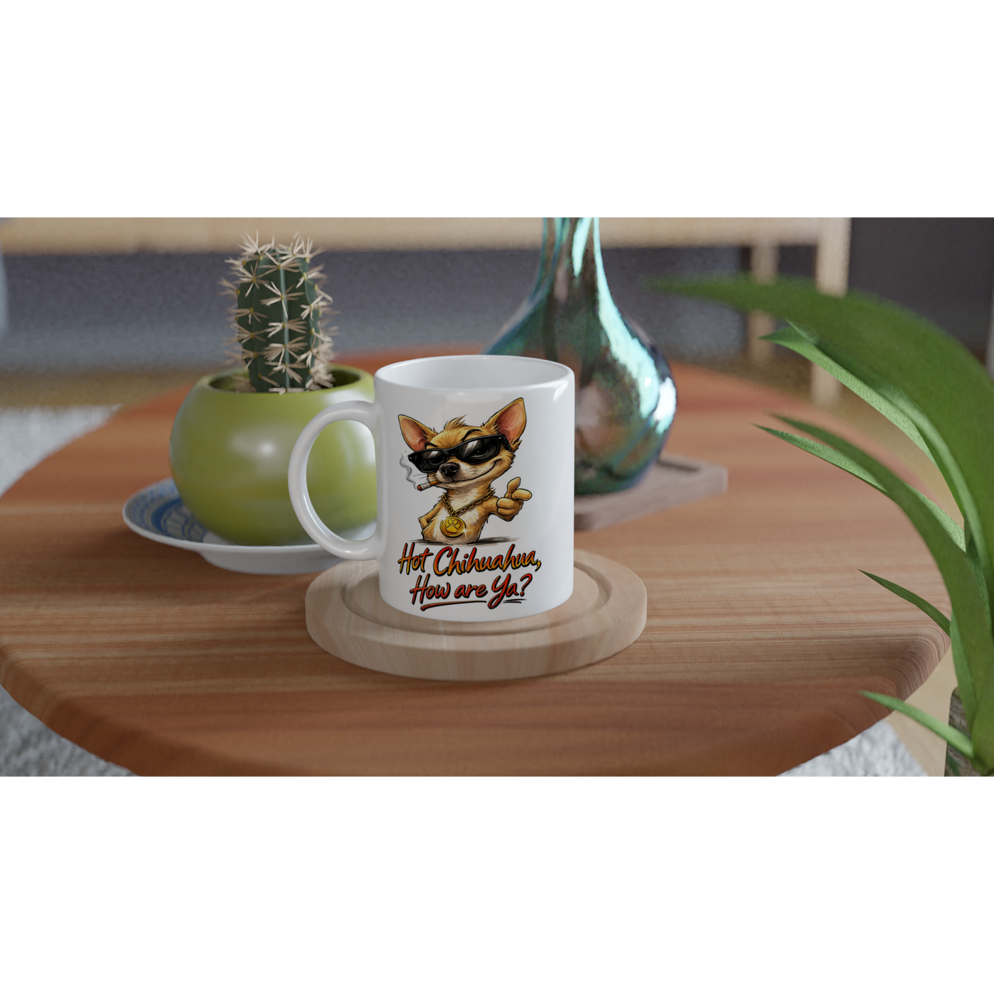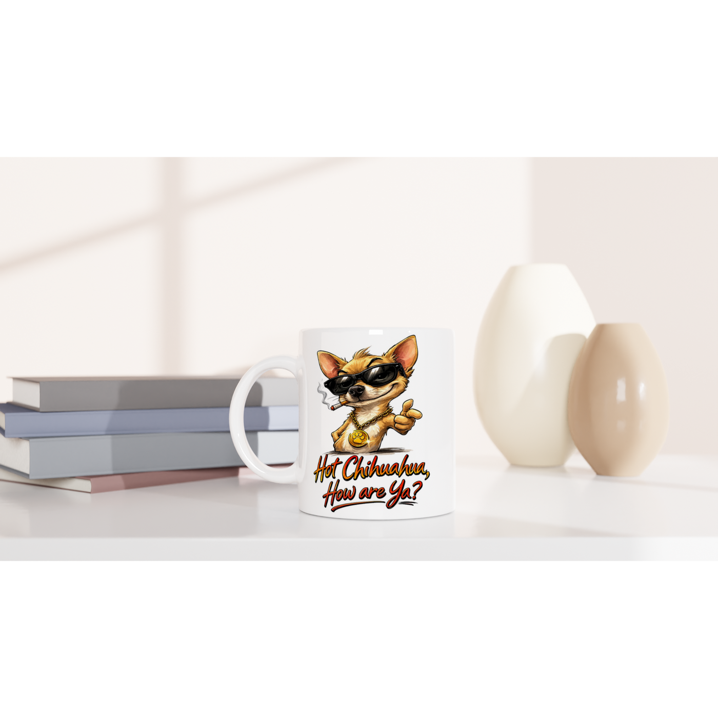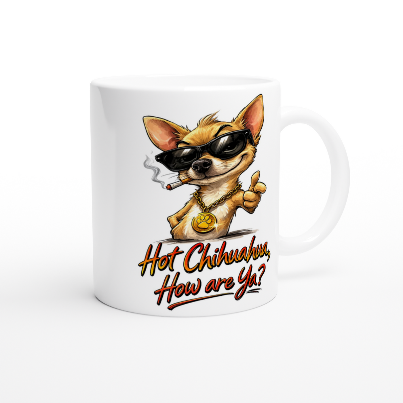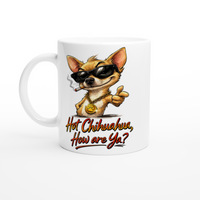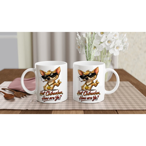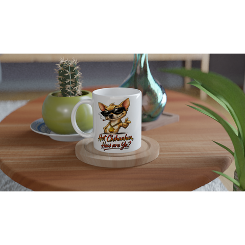 Rocking black sunglasses and a chunky gold medallion, Jose doesn’t just enter a room… he arrives. With his cheeky grin and the bold line “Hot Chihuahua, How are Ya?”, this design brings serious swagger to your morning brew.
